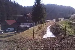 - Wäscherhofbach, von links an den ersten zwei Häusern in der offenen Talsohlenflur, 1,1 km. Quelle liegt nordwestlich des Wäscherhofes auf knapp 390 m ü. NN.