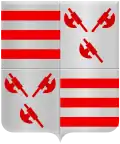 Beschreibung: Im silbernen gevierten Wappen im ersten und vierten Feld drei rote Balken und in den anderen Feldern je drei rote Bartenspitzen auf roten Stielen (2,1) gestellt. Die unteren zeigen nach rechts.