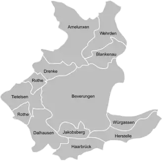 Nach § 3 Abs. 1 ihrer Hauptsatzung gliedert sich die Stadt Beverungen in folgende zwölf Bezirke/Ortschaften,[5] die vor 1970 eigenständige Gemeinden im Amt Beverungen waren: