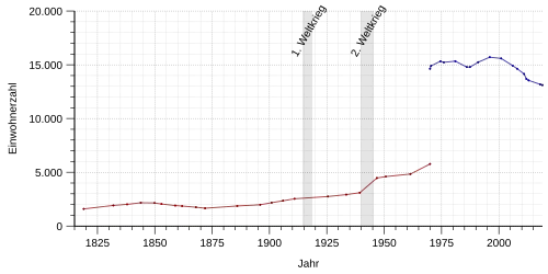 Bei den Zahlen handelt es sich bis 1970 und für 1987 um Volkszählungsergebnisse[15][16][17] und ab 1975 um amtliche Fortschreibungen des Statistischen Landesamtes. Die Zahlen für 1975, 1980 und 1985 sind geschätzte Werte und die Zahlen ab 1990 Fortschreibungen auf Basis der Ergebnisse der Volkszählung von 1987, ab 2012 Fortschreibungen auf Basis des Zensus 2011.[18] Die Angaben beziehen sich ab 1867 sowie für 1946 auf die Ortsanwesende Bevölkerung, ab 1925 auf die Wohnbevölkerung und ab 1987 auf die Bevölkerung am Ort der Hauptwohnung. Vor 1871 wurde die Einwohnerzahl nach uneinheitlichen Erhebungsverfahren ermittelt.