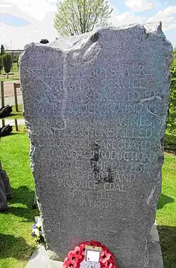 Am Dienstag, den 7. Mai 2013 wurde ein Denkmal für die Bevin Boys enthüllt.[12] Das Denkmal wurde von dem ehemaligen Bevin Boy Harry Parkes entworfen, es besteht aus vier Steinsockeln.[8][13]