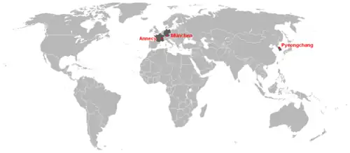 - ↑ Munich, Annecy and PyeongChang move to next level of competition to host 2018 Olympic Winter Games. In: olympic.org. Internationales Olympisches Komitee, 22. Juni 2010, abgerufen am 8. November 2016 (englisch).