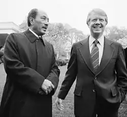 Die Beziehungen zwischen beiden Ländern begannen sich erst nach dem Tod von Nasser (September 1970) zu verbessern. Sein Nachfolger Anwar as-Sadat nahm Geheimverhandlungen mit der Nixon-Regierung auf, wendete sich von der Sowjetunion ab und verwies 1972 15.000 sowjetische Militärberater des Landes.[3] 1973 starte Sadat einen Überraschungsangriff auf Israel, in dem nach einigen ägyptischen Anfangserfolgen eine israelische Gegenoffensive erfolgte. Während des Krieges stimmten die Vereinigten Staaten einer Luftbrücke zur Versorgung Israels zu und akzeptierten im UN-Sicherheitsrat die sowjetischen Vorschläge für einen Waffenstillstand, aber Henry Kissinger ermutigte die israelischen Streitkräfte, weiter nach Ägypten vorzustoßen, nachdem sich das Blatt im Krieg gewendet hatte. Die USA überzeugten Israel schließlich davon, einen Waffenstillstand zu akzeptieren, da das OPEC-Ölembargo und die Drohung des sowjetischen Generalsekretärs Leonid Breschnew mit einem Eingreifen der Sowjets den USA Sorgen machte.[6] Sadat begann sich danach endgültig den USA zuzuwenden und nahm die diplomatischen Beziehungen zu diesen 1974 wieder auf. Die USA boten den Ägyptern umfangreiche Militär- und Wirtschaftshilfen und ein Bündnis im Gegenzug für einen dauerhaften Frieden mit Israel an. Von Washington ermutigt, nahm Sadat Verhandlungen mit Israel auf, die zu dem von US-Präsident Jimmy Carter vermittelten Camp-David-Abkommen und 1979 zu einem historischen Friedensvertrag mit Israel führten.[3] Dies isolierte Ägypten in der arabischen Welt. Islamische Extremisten ermordeten Sadat am 6. Oktober 1981.[7]