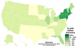 Eine große italienische Einwanderungswelle in die Vereinigten Staaten begann im 19. Jahrhundert. Ein großer Teil der Einwanderer stammte aus Süditalien und zog bevorzugt in die Neuengland-Staaten (New York City, Boston) und den Mittleren Westen (Chicago, Philadelphia). Die Italienischstämmigen Einwohner lebten anfangs segregiert in eigenen Stadtvierteln wie Little Italy in Manhattan. Mit der Migration aus Italien begann die Präsenz von Mafia-Gruppen in Form Amerikanischen Cosa Nostra als Ableger ihrer „Originale“ in neuer Umgebung, welche sich in den amerikanischen Metropolen Auseinandersetzungen untereinander sowie mit irischen Banden und der Kosher Nostra lieferten. Gegen die weitverbreitete Diskriminierung und die stereotype Assoziation der Italoamerikaner mit dem organisierten Verbrechen bildeten sich bald darauf viele italoamerikanische Verbände und Bürgerrechtsorganisationen. Italoamerikaner haben im Laufe der Zeit zahlreiche bedeutende Beiträge zur amerikanischen Gesellschaft, Kultur, Küche und Wirtschaft geleistet. Im 20. Jahrhundert kam es zu einer weitgehenden Anpassung an die Mehrheitsgesellschaft, allerdings bestehen weiterhin zahlreiche italoamerikanische Organisationen. 2019 gaben knapp 16 Millionen US-Bürger an vollständig oder teilweise italienischer Abstammung zu sein, wovon knapp sechs Millionen angaben vollständig italienischer Abstammung zu sein. Italienische Abstammung zählt damit zu den häufigsten in den USA.[21] Viele Italoamerikaner sprechen allerdings kein Italienisch mehr und 2018 unterhielten sich noch knapp 600.000 Menschen daheim auf Italienisch.[22]