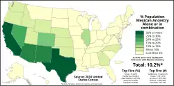 Mit der Verabschiedung des Immigration Act of 1924, der die Einwanderung aus Süd- und Osteuropa einschränkte, begann die Einwanderung aus Mexiko anzusteigen.[13] In den 1940er Jahren wurde das Bracero-Programm zum größten Anwerbeprogramm aller Zeiten und sorgte in den nächsten 20 Jahren für den Abschluss von 5 Millionen Arbeitsverträgen. Im Jahre 2021 lebten über 37 Millionen mexikanische Amerikaner in den USA, von denen knapp 10 Millionen in Mexiko geboren wurden.[34] Die meisten mexikanischen Amerikaner leben im Südwesten der USA (über die Hälfte in den Bundesstaaten Kalifornien und Texas). Die Bewegung für die Emanzipation der mexikanischen Gastarbeiter begann in den 1950er Jahren unter César Chávez und der als Chicano Movement bezeichneten Bürgerrechtsbewegung der mexikanischen Amerikaner.[35] Es hat sich eine lebendige mexikanisch-amerikanische Kultur und Küche in den USA etabliert.
