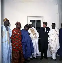 Die offiziellen Beziehungen zwischen den USA und Nigeria begannen 1960, dem Jahr der nigerianischen Unabhängigkeit von Großbritannien.[1] Die USA erkannten das neue Land umgehend an und eröffneten eine Botschaft in Lagos (damals der Hauptstadt des Landes). Präsident Dwight D. Eisenhower entsandte den New Yorker Gouverneur Nelson Rockefeller als seinen Vertreter zu den Unabhängigkeitsfeierlichkeiten in Lagos. In den frühen 1960er Jahren unterstützten die USA Nigeria mit wirtschaftlicher Entwicklungshilfe. So bewilligte die Regierung John F. Kennedys 1961 ein großes Entwicklungskreditprogramm für Nigeria, um den jungen Staat wirtschaftlich zu fördern. Nigeria wurde als eines der größten Länder Afrikas extra gefördert, um einen Modellstaat aufzubauen.[2] Nigeria galt Washington zunächst als vielversprechende Demokratie und wichtiger afrikanischer Partner, und der erste nigerianische Premierminister Abubakar Tafawa Balewa wurde in den USA mit Wohlwollen empfangen.