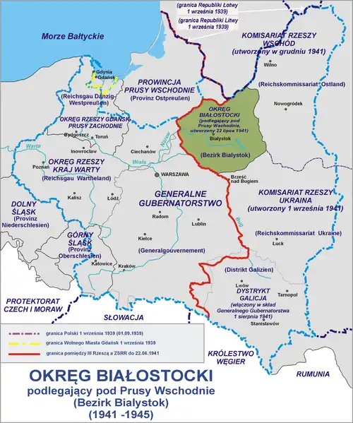 Der Bezirk Bialystok hatte zu Beginn 1.382.000 Einwohner. Hiervon waren 830.000 polnischer, 300.000 weißruthenischer (weißrussischer), 200.000 ukrainischer, 50.000 jüdischer und 2.000 deutscher Herkunft.