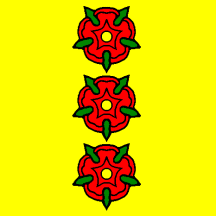 - In Gold drei pfahlweise gestellte fünfblättrige, rote Rosen mit goldenen Butzen und grünen Kelchblättern