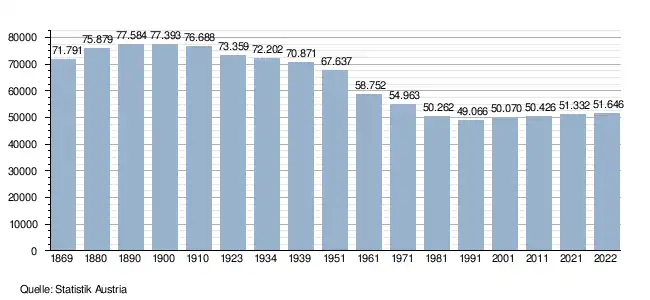 Im Jahre 1890 erreichte die Einwohnerzahl des Bezirks mit 77.584 Personen ihren Höchststand, denn seither nimmt die Bevölkerung im Gegensatz zum Bundesland stetig ab. Derzeit (1. Jänner 2025) wohnen im Bezirk 52.035 Personen.