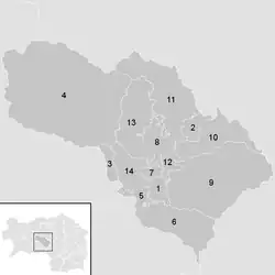 | Gemeinde | Lage | Einw. | Fläche | Ew/km² | Gerichtsbezirk | Region | Typ |