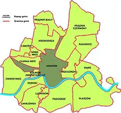- Teilen des Bezirks Krakau-Magistrat (Gemeinden Czarna Wieś mit Kawiory, Dąbie mit Głębinów und Beszcz, Piaski mit Grzegórzki)