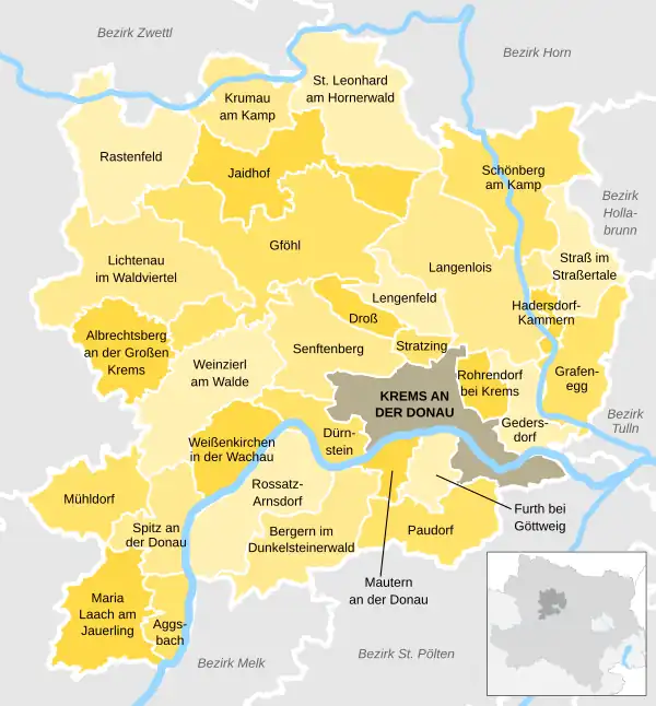 Zum Bezirk Krems gehören 30 Gemeinden, darunter vier Städte und 20 Marktgemeinden.