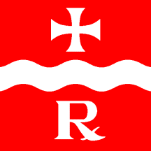 In Rot ein weisser Querfluss über einem weissen R, überhöht von einem weissen Tatzenkreuz.