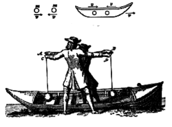 Huygens: Zwei Beobachter (einer im Boot, einer an Land) beschreiben die Kollision zwischen zwei Kugeln unterschiedlich.[5]