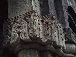 Das Wandsegment oberhalb der Kapitelle scheint nicht nur über die seitlichen Nischen, sondern über die gesamte untere Fassade herauszuragen und bildet einen optischen hohen Schwerpunkt des Baukörpers, wie er auch bei der Kathedrale von Ani (1001 vollendet) vorkommt. Auch die plastische Gestaltung des Innenraums steht mit der Architekturschule von Ani in Verbindung.[2] Die Laibungen der Durchgänge in den Längswänden sind wie die Kapitelle reich dekoriert.