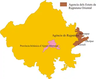 Von 1828 bis 1947 war Bharatpur britisches Protektorat. Der Fürstenstaat hatte 1941 eine Fläche von 5123 km² und 560.000 Einwohner. Er trat am 17. März 1948 der Matsayas Union bei. Am 7. April 1949 schloss er sich Indien an und wurde am 15. Mai 1949 in den Bundesstaat Rajasthan eingegliedert. Am 1. November 1956 erfolgte die Auflösung des Fürstenstaats.