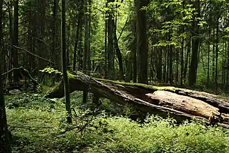 Der Nationalpark ist Lebensraum für über 12.000 Tierarten mit allein 9000 Insektenarten.[4] Viele der Tier- und Pflanzenarten sind endemisch, d. h. nur im Naturschutzgebiet Białowieża anzutreffen. Auch stehen dort mit die höchsten Laubbäume Europas: bis zu 50 Meter hohe Eichen und bis zu 40 Meter hohe Eschen.[5] Die Natur ist wegen der minimalen Eingriffe des Menschen sehr vielgestaltig, so bilden die nicht entfernten verrottenden Baumstämme und -reste besondere Lebensbedingungen, wie sie in konventionell bewirtschafteten Wäldern nicht anzutreffen sind. Die Ursprünge des Waldes reichen bis 8000 v. Chr. zurück.