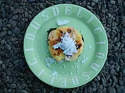 - Bibingkang malagkít wird aus Klebreismehl hergestellt.[4] Es ist feucht und wird normalerweise in würfelförmigen Blöcken serviert.