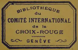 - ↑ Gustave Moynier: La bibliothèque du Comité international. In: Bulletin International des Sociétés de la Croix-Rouge. 9 (35): 199. Genf 1878.