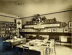 Im Jahr 1871 bezog das IKRK einen offiziellen Sitz in der Rue de l’Athénée Nr. 3 und damit in unmittelbarer Nähe von Moyniers prächtiger Privatresidenz.[1][4][5] Obwohl es sich um eine der repräsentativsten Adressen der Stadt handelte, waren die Räumlichkeiten mit gerade einmal drei Zimmern vergleichsweise bescheiden.[6] Eines von ihnen diente sowohl als Bibliothek wie auch als Museum.[7]