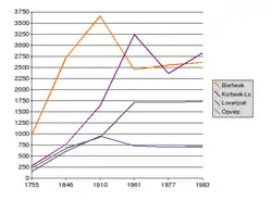 Bis zum Jahre 1910 nahm die Bevölkerung in Bierbeek stetig zu. Der starke Rückgang bis 1961 ist auf die zwei Weltkriege zurückzuführen. Danach setzte wieder ein langsames Wachstum ein. Korbeek-Lo erfuhr seine stärkste Bevölkerungszunahme nach dem Zweiten Weltkrieg, denn die Nähe Löwens wirkte sich positiv aus. Durch die Gemeindereform 1977 verlor Korbeek-Lo den städtischsten Teil seiner Gemeindefläche an Löwen, wodurch sich der plötzliche Einbruch erklären lässt.