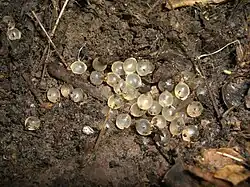 Zwei bis drei Wochen nach der Paarung kommt es zur Eiablage. Eier können in temperierten Kellerräumen zu allen Jahreszeiten abgelegt werden. Die Anzahl der abgelegten Eier pro Gelege schwankt zwischen einem Ei bis zu 80 Eiern, je nach Alter und Ernährungszustand des Tieres[5] (bzw. 12 bis 51 Eiern nach Hesse[11]). Ein Tier kann etwa 250 bis 350 Eier legen. Die Eier sind elliptisch mit ausgezogenen Schleimzipfeln an den Polen, mit denen sie zu Schnüren miteinander verbunden sind. Selten wird nur ein Ei oder werden nur wenige Eier abgesetzt, im Durchschnitt 20 bis 50 Eier. Die Eier sind sehr variabel in der Größe; sie schwankt von 4,2 bis 4,5 × 2,5 bis 2,7 mm bis zu 9,6 bis 10,4 mm × 5,1 bis 6,2 mm. Im Normalfall sind die Eier zwischen 6 und 8 mm × 4 bis 5 mm groß. Die Eier haben eine gelblichbraune Farbe, sind aber ansonsten wasserklar. Erst mit beginnender Entwicklung des Embryos trübt sich das Ei etwas ein. Die Jungtiere schlüpfen in Abhängigkeit von der Temperatur nach 23 bis 27 Tagen, unter kühleren Bedingungen zwischen 30 und 34 Tagen, oder auch 43 bis 47 Tagen, wobei nicht alle Jungtiere die Eihülle gleichzeitig verlassen, sondern über eine Spanne von mehreren Tagen.