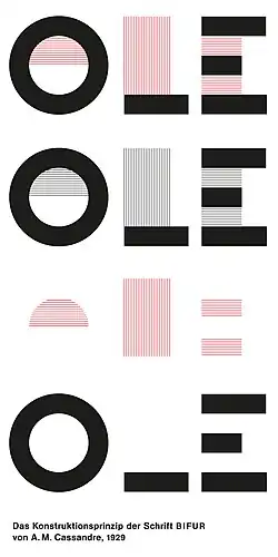 Bifur ist eine der eindrucksvollsten Akzidenzschriften der Art déco Ära. Sie wurde für die Werbung geschaffen und sollte sich in erster Linie im Gedächtnis der Betrachter einprägen. Cassandre vereinfachte den Aufbau der Buchstaben, verstärkte den geometrischen Aspekt ihrer Formen und schraffierte einzelne Flächen der Buchstaben oder ihre Punzen. Die flächigen, geometrischen Buchstabenformen und die schraffierten Flächen waren als zweiteilige Lettern (auf zwei getrennten Kegeln) angelegt, so konnte die Bifur in zwei Farben gedruckt werden. Bifur ist durch die fetten und dünnen Linien und Querbalken eine sehr auffällig gestaltete Schrift des Art déco.[2][3]