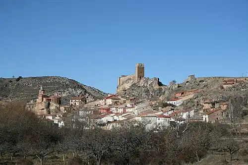 - Von der um die Mitte des 14. Jahrhunderts aus Bruchsteinen erbauten, aber kurz darauf im Krieg gegen Kastilien zerstörten Burg (castillo) stehen noch Reste des ehemals ca. 18 m hohen Bergfrieds (torre del homenaje) und der Burgmauern.[6][7][8]