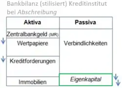 Beispiel Bankbilanz: Wertminderungen von Vermögenspositionen (Aktiva) vermindern auf der anderen Seite bilanztechnisch das Eigenkapital (Passiva).