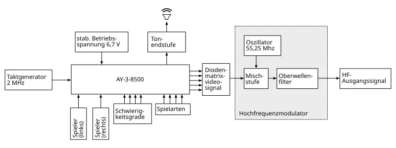 Spielarten und Schwierigkeitsgrade werden durch externe Schalter und äußere elektronische Bauteile wie etwa Widerstände eingestellt. Auch die Auswahl eines Spiels erfolgt durch einen Schalter, mit dem die zum jeweiligen Spiel gehörenden Baugruppen innerhalb des Chips aktiviert und alle nicht benötigten deaktiviert werden.[15] Die Erzeugung der elektrischen Signale für das Fernsehbild erfolgt durch den AY-3-8500 gemäß den technischen Spezifikationen für die in den 1970er und frühen 1980er Jahren ausschließlich genutzten analogen Röhrenfernsehgeräte. Die vom Schaltkreis generierten Bilddaten werden in einer externen elektronischen Baugruppe, dem Videosummierer, zum schwarzweißen BAS-Signal zusammengeführt. Anschließend erfolgt mithilfe eines Hochfrequenzmodulators und eines Antennenkabels die Einspeisung in die Antennenbuchse des Fernsehgeräts.[17] Die Tonsignale werden durch den in der Konsole verbauten Lautsprecher ausgegeben.[18]