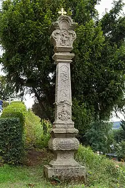 Der von Voluten flankierte Aufsatz wird von einem eingezogenen Rundbogen geschlossen, auf dem sich ein verziertes und vergoldetes Eisenkreuz befindet. Die Basis und der Rundbogen sind mit Friesen verziert. An der Westseite des Aufsatzes befindet sich ein Relief des Erzengels Michael, die Ostseite zeigt eine Darstellung der Glosberger Muttergottes. Eine Marienstatue in dem nördlich gelegenen Wallfahrtsort, der heute ein Stadtteil von Kronach ist, soll im Jahr 1727 mehrmals blutige Tränen geweint haben, weshalb dieses Motiv auf zahlreichen Bildstöcken im Frankenwald zu finden ist.[1]