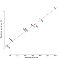 Die Bildungsproduktionsfunktion wendet das ökonomische Konzept einer Produktionsfunktion auf den Bildungsbereich an. Es setzt verschiedene Inputs, die sich auf das Lernen eines Schülers auswirken (Schulen, Familien, Mitschüler, Nachbarschaften usw.), mit gemessenen Outputs in Beziehung, darunter späterer Arbeitsmarkterfolg, Hochschulbesuch, Abschlussquoten und standardisierte Testergebnisse. Die Idee stammt vom Soziologen James S. Coleman. Der 1966 veröffentlichte Coleman-Bericht kam zum Ergebnis, dass der Effekt verschiedener schulischer Leistungen auf die Schülerleistungen im Vergleich zum Einfluss von Familien und Freunden gering war.[24] Spätere Arbeiten von Eric A. Hanushek, Richard Murnane und anderen führten die Struktur der „Produktion“ in die Betrachtung der Lernergebnisse von Schülern ein. Hanushek, Wößmann et al. (2008) berichteten über eine sehr hohe Korrelation zwischen „bereinigter Wachstumsrate“ und „bereinigten Testergebnissen“. Sie maßen dabei vor allem mathematische und naturwissenschaftliche Leistungen. Verbesserungen waren auch ohne finanzielle Leistungen möglich.[25]