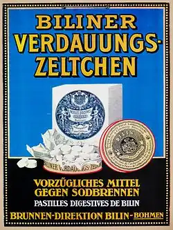 Aus Abdampfrückständen der „Biliner Sauerbrunnen“ wurden Verdauungszeltchen (auch „Biliner Pastillen“ oder öfter „Pastilles digestives de Bilin“ genannt) im 19. Jahrhundert hergestellt. Sie wurden als Mittel bei Verdauungsbeschwerden, Sodbrennen und Magenleiden vertrieben. Von diesen „Verdauungszeltchen“ kamen am Ende des 19. Jahrhunderts 200.000 Schachteln jährlich zum Versand.[4] Die Produktion der „Verdauungszeltchen“ wurde nach dem Ersten Weltkrieg eingestellt.