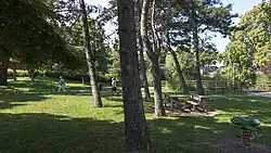 - Schwarzkiefer (Pinus nigra), Nadelbaumgruppe im Zentrum des Parks