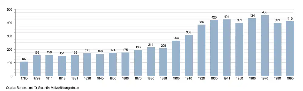 - ↑ Daten der Eidgenössischen Volkszählungen ab 1850 nach Gemeinden. (XLSX; 10 MB) Bundesamt für Statistik, Neuchâtel, 12. Juli 2024, abgerufen am 18. September 2025 (Öffnung in Excel nur über "Anhang/Excel-Datensatz" möglich).