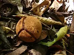 Die 5 bis 8 Zentimeter langen, etwas kantigen, lokuliziden Kapselfrüchte sind ledrig, glatt oder etwas schuppig. Die Kapselfrüchte öffnen sich mit meist drei Fruchtklappen[4] und enthalten meist nur einen[3][4], selten bis zu drei Samen.[2]