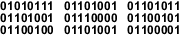 - Maschinencode eines Computerprogramms: Er existiert als eine lange Folge von Bits. Diese Bits sind z. B. zu ASCII-Texten, Fest- oder Gleitkommazahlen, Adressangaben (in jeweils individueller Länge) und zu Maschinenbefehlen 'gebündelt' und liegen scheinbar ohne Struktur im Hauptspeicher oder in Programmbibliotheken. Alleine die im Quelltext beschriebenen Anweisungen/Deklarationen bestimmen das Format dieser Codeteile und damit auch den Code. Diesen Festlegungen entsprechend verwendet der Programmierer Befehle, die, als Maschinenbefehle vom Übersetzer erzeugt, zu den definierten Datentypen und Codes passen.