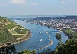 Politisch gehörte das rechte Rheinufer von 1815 bis 1866 zum Herzogtum Nassau. Am linken Ufer grenzten oberhalb der Nahe das Großherzogtum Hessen und unterhalb das Königreich Preußen mit seiner Rheinprovinz an. 1866 annektierte Preußen das Herzogtum Nassau. Nassau hatte Preußen bereits vor 1866 den Ausbau der Gebirgsstrecke überlassen.[35] In der Gegenwart ist der Rhein die Grenze zwischen Rheinland-Pfalz am linken und Hessen am rechten Ufer.