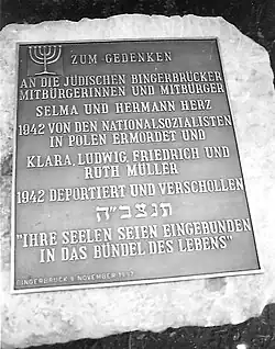 Während des NS-Staates gerieten auch die Juden in Bingerbrück immer mehr in Bedrängnis. Die jüdische Gemeinde in Bingerbrück war nicht sehr groß, aber unter ihren Mitgliedern waren angesehene Gewerbetreibende: Familie Wolf, die Familien Wohlgemuth, Familie Winkelstein, Familie Müller und Familie Herz. 1942 wurden Hermann und Selma Herz und die Familie Müller deportiert und ermordet. Seit 1997 ist am Ehrenmal auf Initiative und Betreiben des Heimatvereins Bingerbrück eine Gedenkplatte für die deportierten Mitbürger angebracht.