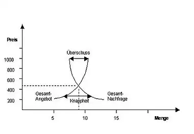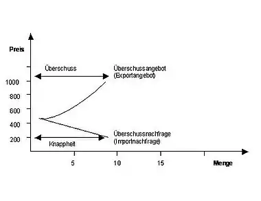 Der Binnenpreis (Gleichgewichtspreis) auf dem inländischen Markt wird bestimmt durch den Schnittpunkt der Angebots- und Nachfragekurve. Bei diesem Preis stimmt die angebotene Menge der Produzenten mit der Nachfragemenge der Konsumenten überein (Gleichgewichtsmenge). In Abb. 1 liegt der Gleichgewichtspreis bei 450 Geldeinheiten pro Menge. Bei allen Preisen, die über dem Gleichgewichtspreis liegen, kommt es zu einem Angebotsüberschuss eines bestimmten Gutes. Bei einem Preis, der unter dem Gleichgewichtspreis liegt, wird ein Gut mehr nachgefragt als die Produzenten bereitstellen wollen, so dass ein Nachfrageüberschuss entsteht. Es kommt somit zu einer Preissenkung bei einem Überschussangebot bzw. zu einem Preisanstieg bei einer Überschussnachfrage.