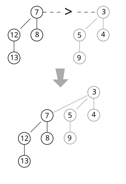 - 2, so wird der Baum, dessen Schlüssel an der Wurzel größer ist, zum am weitesten links stehenden Kind des anderen Baumes gemacht und der so entstehende Baum der Ordnung k+1 als Übertrag behalten.
