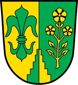 Blasonierung: „Über einem von Grün und Gold gespaltenen Treppengiebel im Schildfuß gespalten von Gold und Grün; vorne eine heraldische Lilie, hinten drei heraldische Rosen an beblättertem Stiel in verwechselten Farben.“[6] |