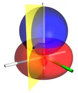 Bisphärische Koordinaten (englisch bispherical coordinates )[ 7] :665 [ 4] :100 [ 1] :376–379 entstehen durch Rotation der Kreise im #Bild oben um die Verbindungsstrecke der beiden Foki, die in die z-Koordinatenlinie gelegt werden; diese ist im Bild wie üblich senkrecht orientiert. Ein mögliches Koordinatensystem benutzt die ebenen Koordinaten η, θ und den Drehwinkel ψ um die Rotationsachse,[ 1] :376–379 [ 4] :100 was in den folgenden Abschnitten ausführlich dargestellt wird. Eine andere Möglichkeit benutzt deren Funktionswerte cosh(η ), cos(θ ) und cos(ψ ), was unter #Alternative Formulierung bisphärischer Koordinaten skizziert wird.[ 7] :665