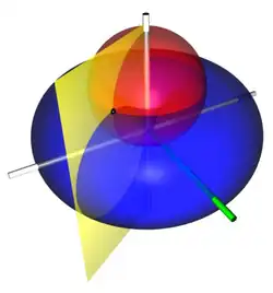 Koordinatenflächen der Bisphärischen Koordinaten bestehen aus Spindeltori (rot), Kugeln (blau) und Halbebenen (gelb).