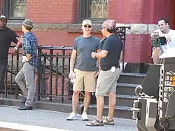 Michael Keaton im Gespräch mit Alejandro G. Iñárritu bei den Dreharbeiten auf der Manhattaner 43rd Street.