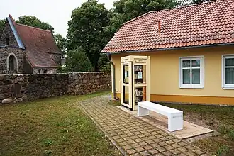 ![]() Kirche, Dorfgemeinschaftshaus, Büchertelefonzelle und Wlan-Bank auf dem Dorfanger von Birkholz 2021
