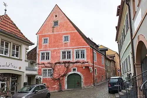 Das Haus besitzt einen schiefeckigen Grundriss und bildet mit seiner Höhe von 18 m den markanten Abschluss eines kleinen Platzraumes, zu dem es giebelständig ausgerichtet wurde. Das Anwesen wird durch ein giebelseitig angebrachtes Rundbogentor erschlossen. Hier war ursprünglich die Kelterhalle als Saal untergebracht. Der Raum ist aus verputztem Bruchstein gemauert. Das erste Obergeschoss aus der Zeit um 1550 ragt oberhalb einer dreifach gekehlten Steinkonsole auf. An der Nordostecke kragt das Obergeschoss leicht nach vorne.[4]
