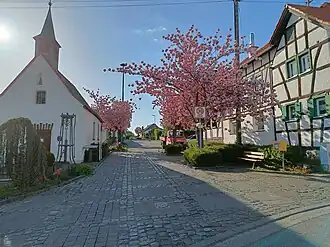 ![]() Die Ortsmitte von Birresdorf. Auf der linken Seite ist die 1671 eingeweihte und 1982 verschobene Kapelle St. Hubertus zu sehen