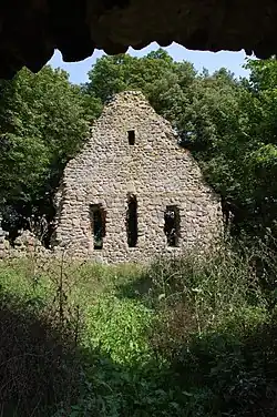 Die aus behauenen Feldsteinquadern erbaute Kirche des Dorfes war ein Rechtecksaal (19,75 × 10,66 m[7]) ohne massiven Westturm. Er entstand in der zweiten Hälfte des 13. Jahrhunderts. Erhalten sind die Giebelfronten. Die Ostseite weist drei spitzbogige Fenster auf, wobei das Mittelfenster bis an die Traufhöhe der Seitenwände heranreicht, die beiden seitlichen Fenster sind niedriger. In der Westseite öffnet sich ein spitzbogiges Portal, im Westgiebel befindet sich ein Rundfenster und 3 Reihen alter Balken-Verankerungen. Ob diese dem Dachstuhl dienten oder einem eventuell außen angefügten Turm Standfeste gaben, ist nicht geklärt. Um die Kirchenruine herum befindet sich der Friedhof, der noch heute für Bestattungen genutzt wird.[8]