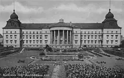 Das neoklassizistische Gebäude ist nach Süden orientiert. Die beiden Eckpavillons tragen neobarocke Hauben und sind wie das Dach kupfergedeckt.